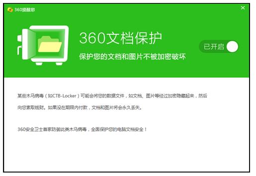 史上最缺德”比特幣病毒CTB-Locker近期傳入中國(guó),眾多企業(yè)辦公電腦遭到感染,導(dǎo)致文檔、圖片等重要資料被病毒加密,如不支付比特幣贖金,這些文件將永遠(yuǎn)無(wú)法恢復(fù)。對(duì)此360安全衛(wèi)士已獨(dú)家推出病毒免疫工具,只要開啟“文檔圖片防護(hù)”就可全面免疫CTB-Locker等 [更多]